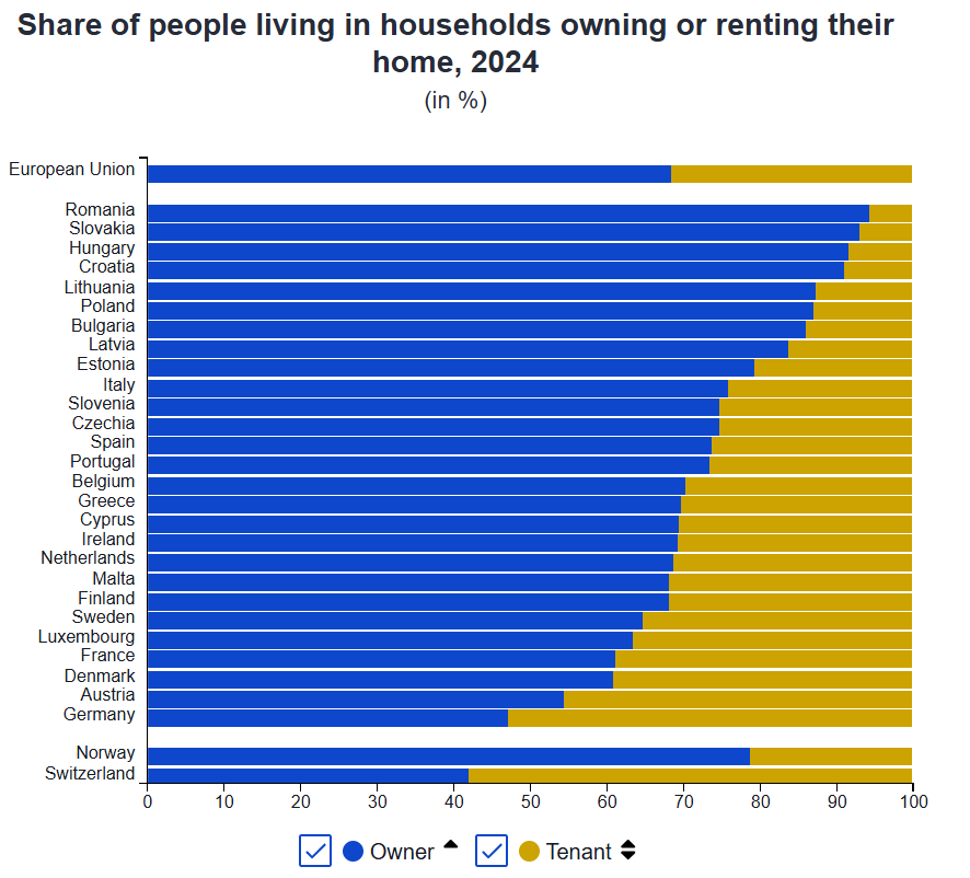 Podľa dostupných údajov žije vo vlastnom bývaní viac než 90 percent slovenských domácností. Ide o jeden z najvyšších podielov v rámci EÚ. Naopak, v západoeurópskych krajinách je bežnejší nájomný model bývania, ktorý poskytuje vyššiu flexibilitu a menšiu finančnú záťaž v počiatočných fázach života.